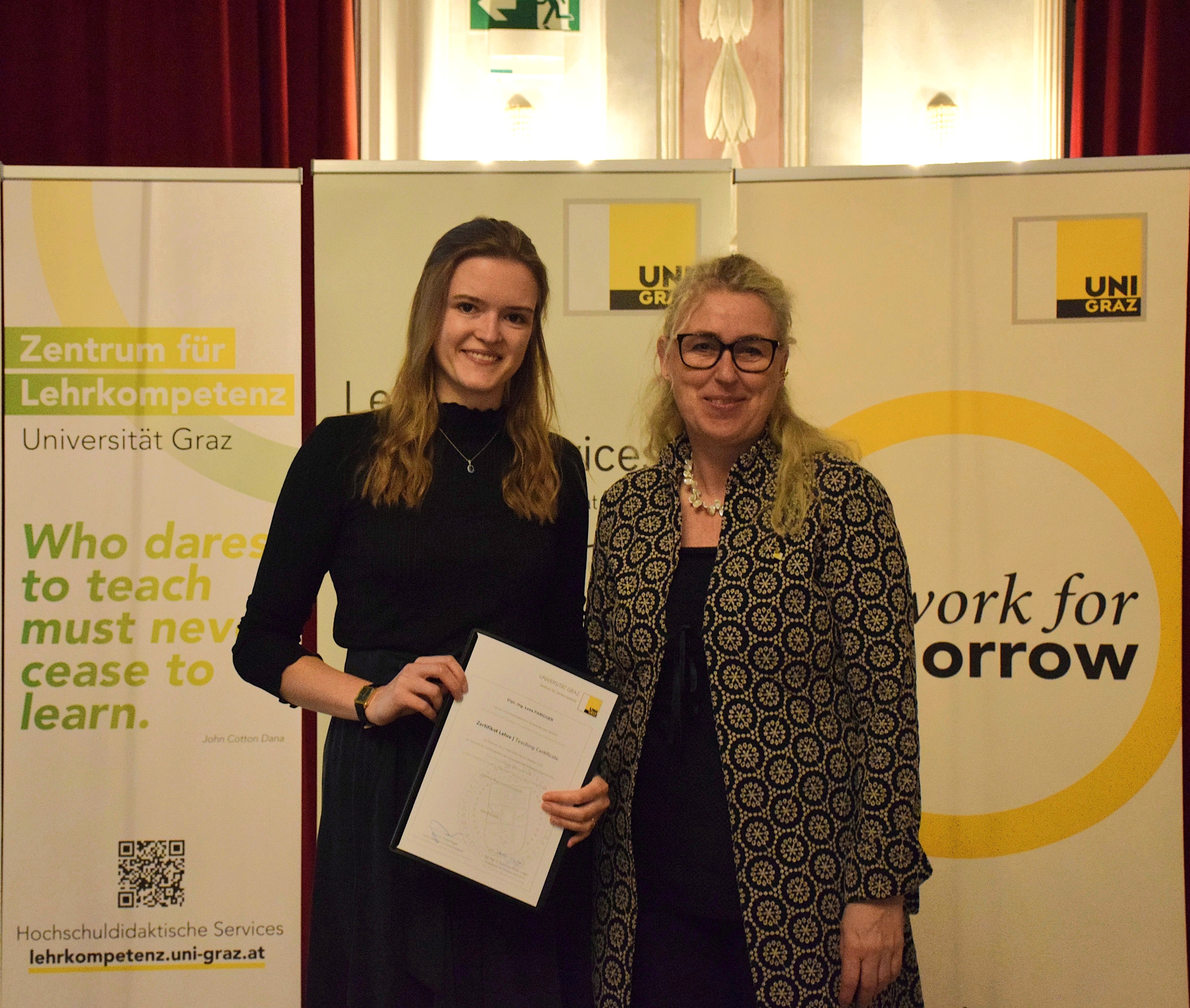 Auch die Gewinnerin des Arqus Teaching Excellence Award wurde im Rahmen der Preisverleihung von Vizerektorin Catherine Walter-Laager gewürdigt. Silvia Kober vom Institut für Psychologie erhielt für ihre Lehrveranstaltung “Angewandte Neuropsychologie in Mensch-Maschine-Systemen“ im Juli den Lehrpreis der internationalen Hochschulallianz ARQUS, den sie in Leipzig entgegennahm.