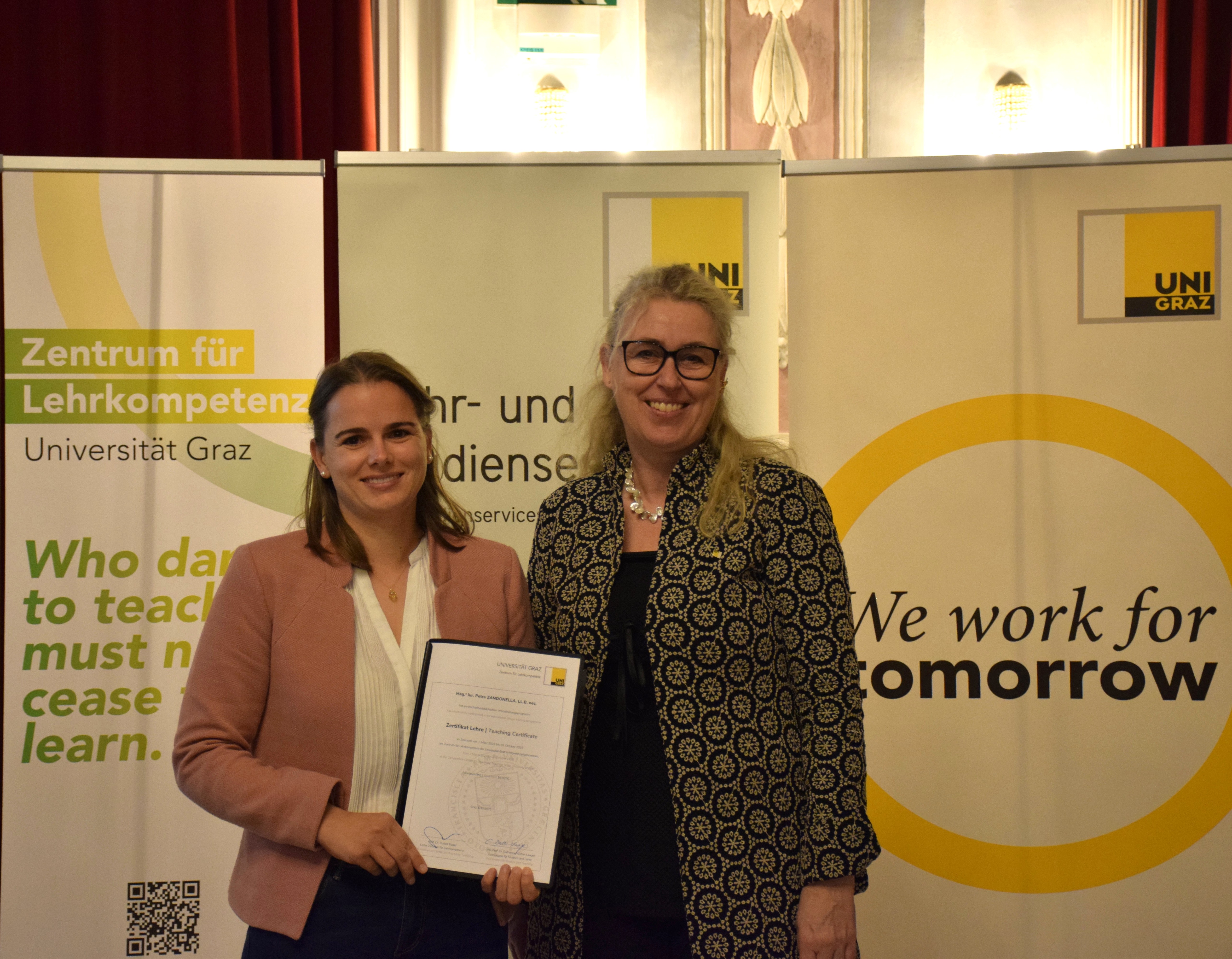 Die Veranstaltung wurde mit der Vergabe des „Zertifikat Lehre“ eröffnet, das im dritten Durchlauf des Programms drei Absolvent:innen zählte: Lena Parigger (Molekulare Biowissenschaften), Petra Zandonella (Rechtswissenschaftliche Grundlagen) und Claudia Zimmermann (Soziologie).