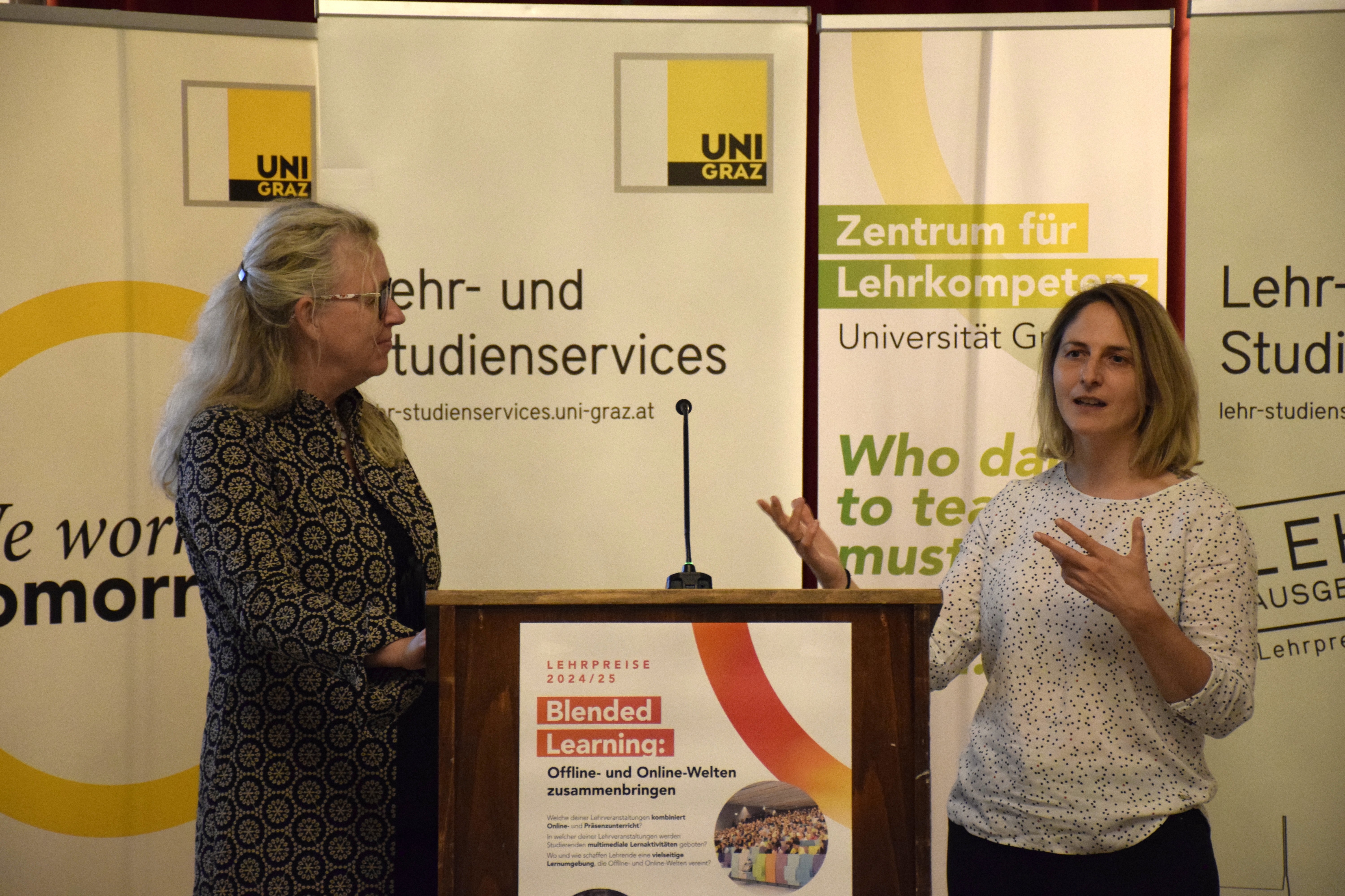 Die Krönung des Abends bildete schließlich die Verleihung der Lehrpreise, welche im Studienjahr 2024/25 unter dem Motto „Blended Learning: Offline- und Online-Welten zusammenbringen“ standen. Vizerektorin Catherine Walter-Laager überreichte gemeinsam mit der ÖH-Vorsitzenden Mary Weitzer sowie der 1. stellvertretenden Vorsitzenden Ida Edlinger-Pammer den Hauptpreis sowie zwei Anerkennungspreise.